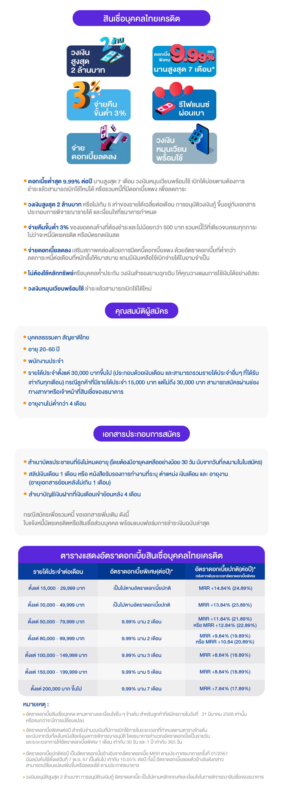 *อัตราดอกเบี้ยพิเศษ 9.99% ต่อปี นานสูงสุด 7 เดือน ขึ้นอยู่กับรายได้ หลังจากนั้นอัตราดอกเบี้ยปกติ MRR+7.84% ถึง MRR+14.84% ต่อปี (17.89% ถึง 24.89% ต่อปี) สูงสุดไม่เกิน 25% ต่อปี อัตราดอกเบี้ย MRR ตามประกาศธนาคาร ครั้งที่ 01/2567 มีผลบังคับใช้ตั้งแต่วันที่ 7 พ.ย. 67 เป็นต้นไป เท่ากับ 10.05% ต่อปี ทั้งนี้ อัตราดอกเบี้ยลอยตัวอ้างอิงดังกล่าวสามารถเปลี่ยนแปลงเพิ่มขึ้นหรือลดลงได้ ตามประกาศธนาคาร
